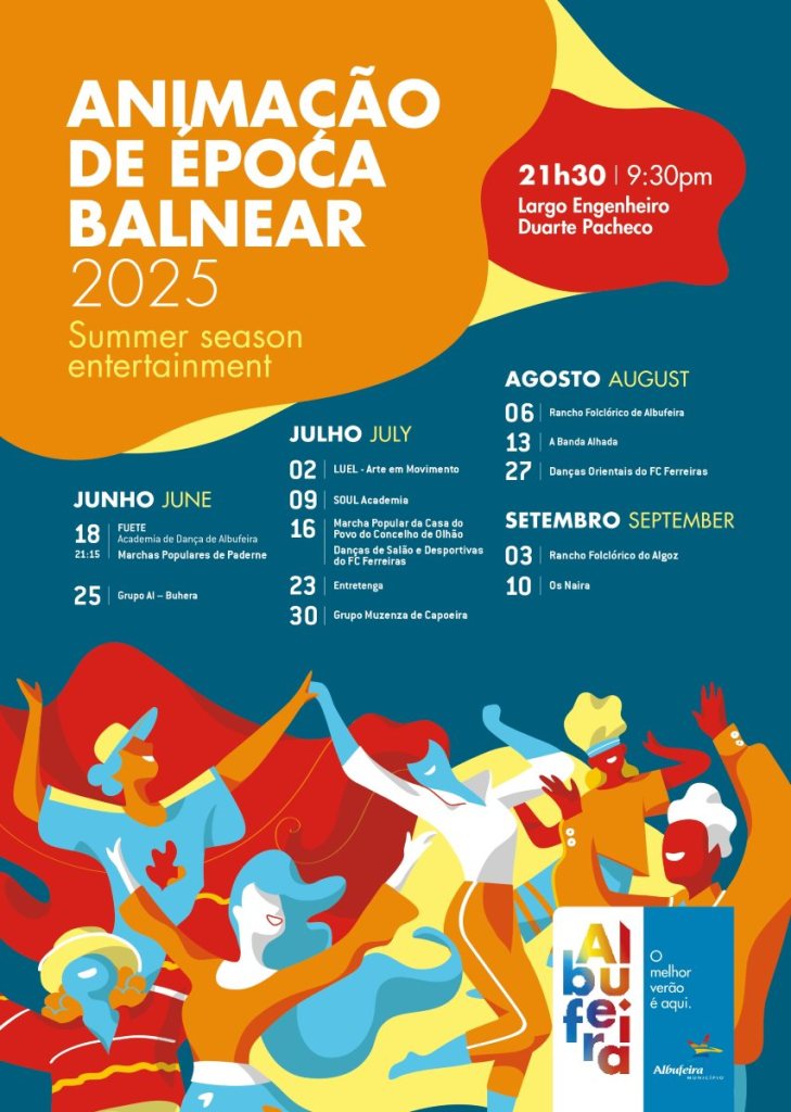 Ao longo de quase 3 meses, o Largo Eng.º Duarte Pacheco vai acolher mais de uma dezena de eventos. A programação inicia já no próximo dia 18 de junho, com a atuação da FUETE – Academia de Dança de Albufeira, e das Marchas Populares de Paderne. O calendário prossegue ao longo do verão com atuações diversificadas. A fechar o mês de junho, destaque para a atuação do grupo de música tradicional portuguesa Al-Buhera (25).