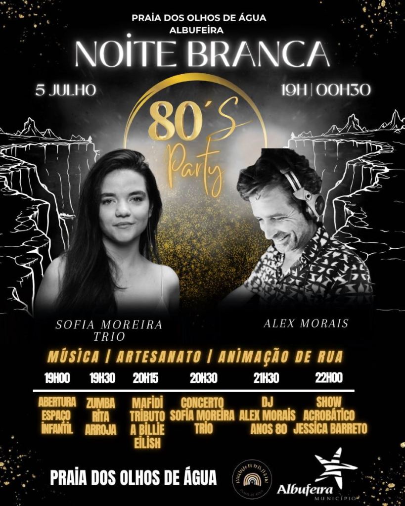 É já este sábado, dia 5 de julho, que a Praia dos Olhos de Água vai receber a Noite Branca. A festa vai ser dedicada a celebrar os anos 80, e conta com muita animação. Estão confirmadas as atuações de Sofia Moreira Trio, e do DJ Alex Morais. O evento tem início previsto para as 19h00, e prolonga-se até às 00h30. A entrada é livre.
