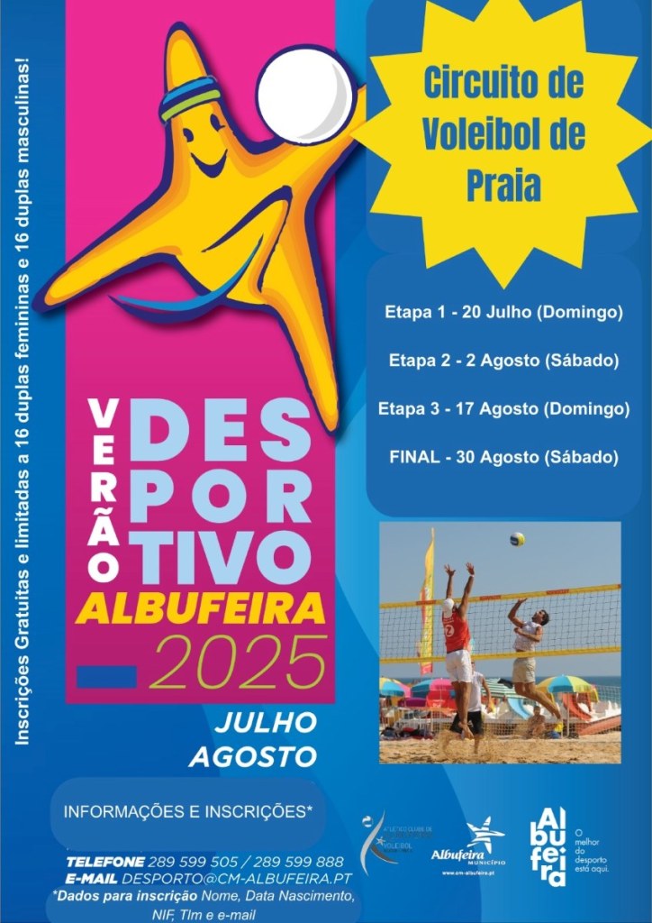 O programa “Verão Desportivo Albufeira 2025” já regressou aos areais, a fim de proporcionar a todos os interessados, a possibilidade de experimentarem modalidades desportivas, conviverem e de entrar em torneios. De julho a setembro, o programa está aberto a residentes e turistas no período da tarde. Há torneios de voleibol de praia, futevólei, beach-tennis e fitness na Praia dos Pescadores e nas Praias dos Salgados (Guia) e Rocha-baixinha (Albufeira e Olhos de Água). A participação é gratuita, devendo ser feita inscrição através do email desporto@cm-albufeira.pt.