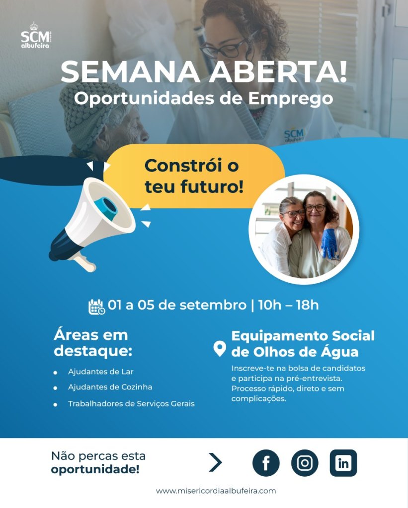 A Santa Casa da Misericórdia de Albufeira promove, entre os dias 1 e 5 de setembro, a Semana Aberta de Ofertas de Emprego, uma iniciativa que visa proporcionar oportunidades de integração profissional a quem procura estabilidade, especialmente após o período de trabalho sazonal.