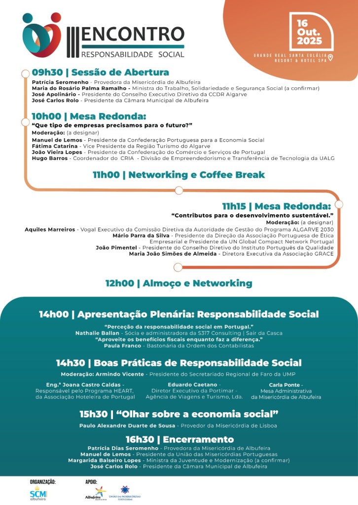 Inscrições gratuitas: www.misericordiaalbufeira.com/iii-encontro-de-responsabilidade-social - Contactos: responsabilidadesocial@scmalbufeira.com | 289 515 427