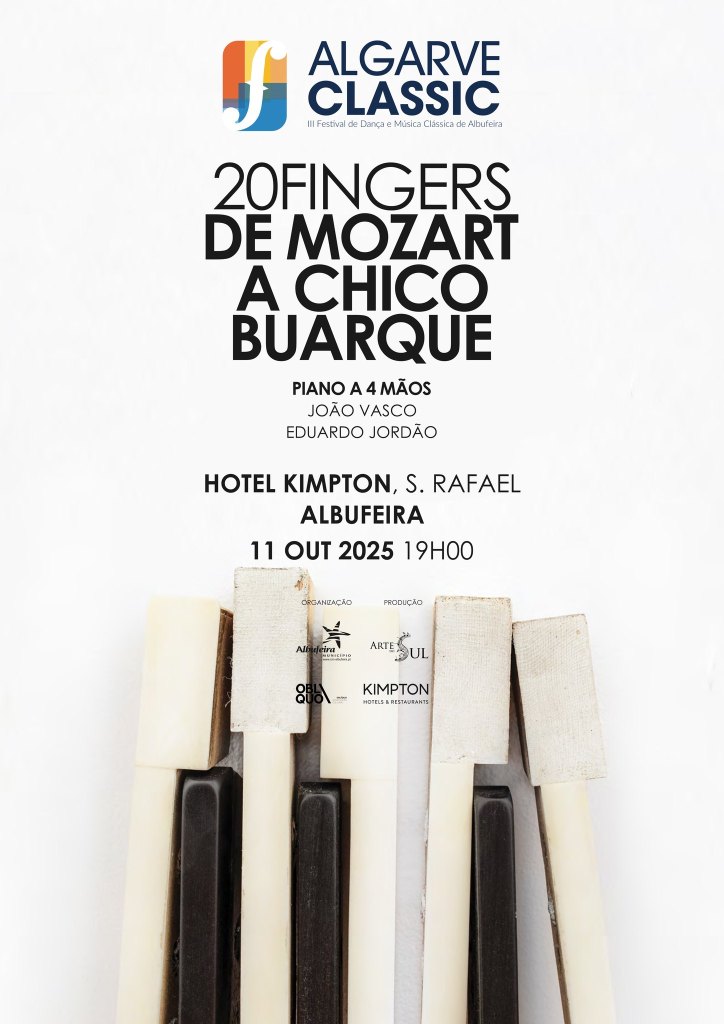 No próximo dia 11 de outubro (sábado), o Algarve Classic – III Festival de Música Clássica de Albufeira está de regresso com “20 Fingers – de Mozart a Chico Buarque”. O concerto, organizado pelo Município de Albufeira com produção da associação Arte do Sul, realiza-se no Hotel Kimpton Atlântico Algarve, em São Rafael, a partir das 19h00.