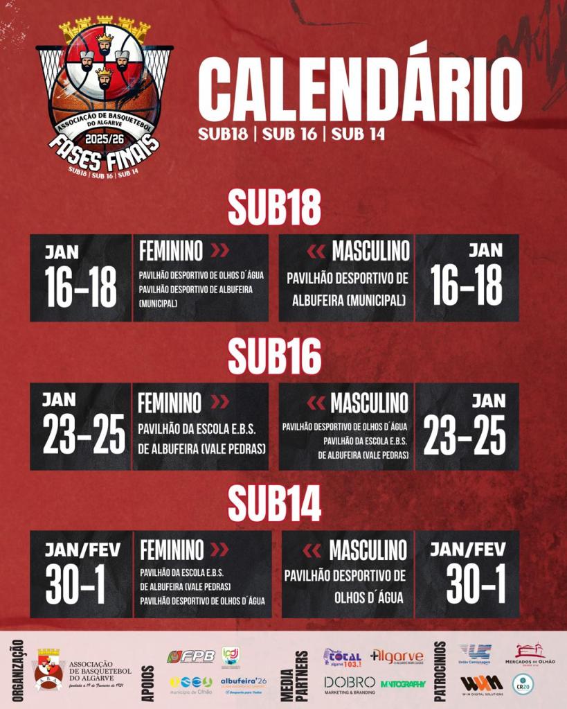 No fim-de-semana de 23, 24 e 25 de Janeiro, vão decorrer as Fases Finais Regionais do escalão de SUB16, Masculinos e Femininos, no Pavilhão da Escola E.B.S. de Albufeira (Vale Pedras).